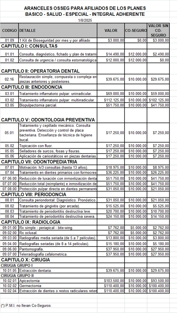 Los Planes Integral e Integral adherente tienen 4 (cuatro) prestaciones por mes y no se debe cobrar co-seguros para la Obra Social OSSEG. |